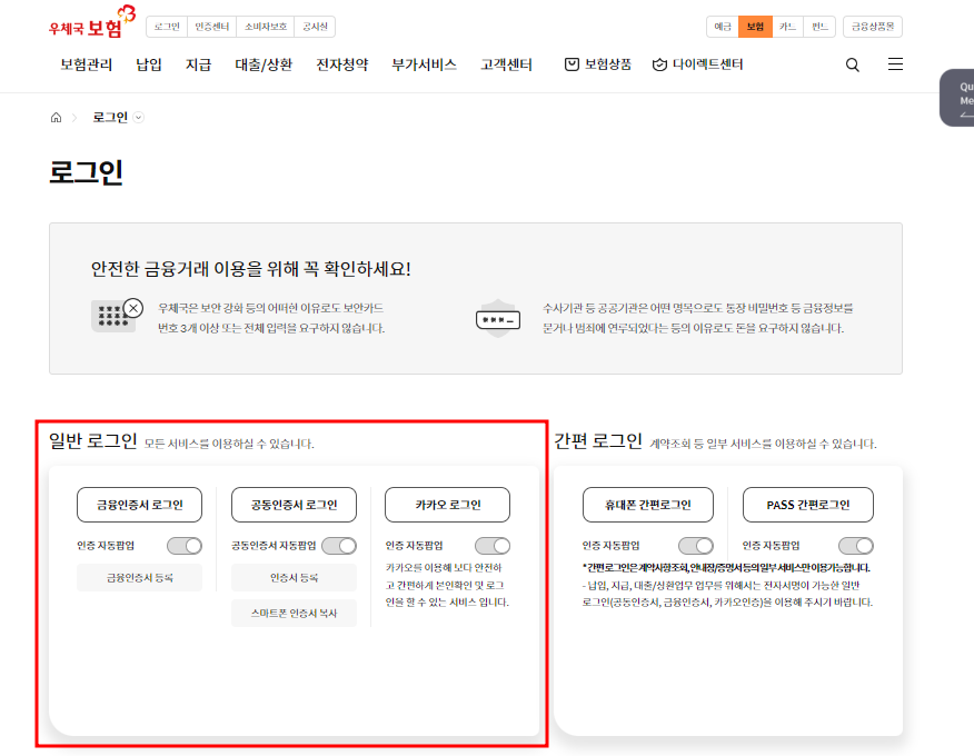 - '보험금 청구'를 클릭하신 후 일반 로그인을 해주시면 됩니다. '카카오 로그인'을 선택해주시면 간편하게 로그인하실 수 있습니다.