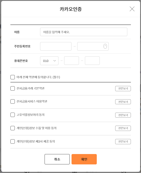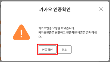 - '카카오 로그인'을 클릭하시면 카카오인증 이라는 창이 뜹니다. 본인인증을 위한 내용을 기재하신 후 하단에 내용을 읽어 보신 후 체크박스에 체크를 해주시면됩니다. 체크가 끝나시면 '확인' 버튼을 클릭해주시면 마무리 됩니다.