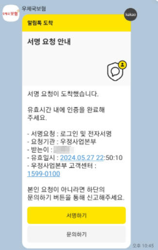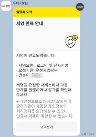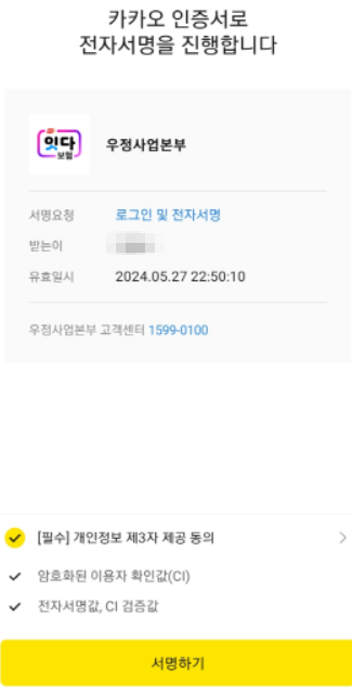 - '카카오 인증'에서 본인 인적사항을 입력하신 후 '확인' 버튼을 클릭하시면 카카오톡으로 우체국 보험 알림톡이 도착합니다. 서명 요청 안내 내용을 확인하신 후 하단에 '서명하기'를 클릭해주시면 됩니다.