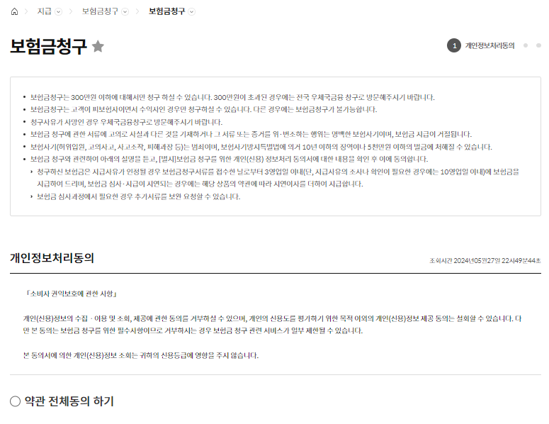 - 개인정보처리 동의를 해주시면 다음단계인 보험금 청구서 작성을 해주시면 되십니다. 보험금 청구서 작성을 해주시 후 관련 서류를 스캔하여 업로드해주시면 됩니다.
