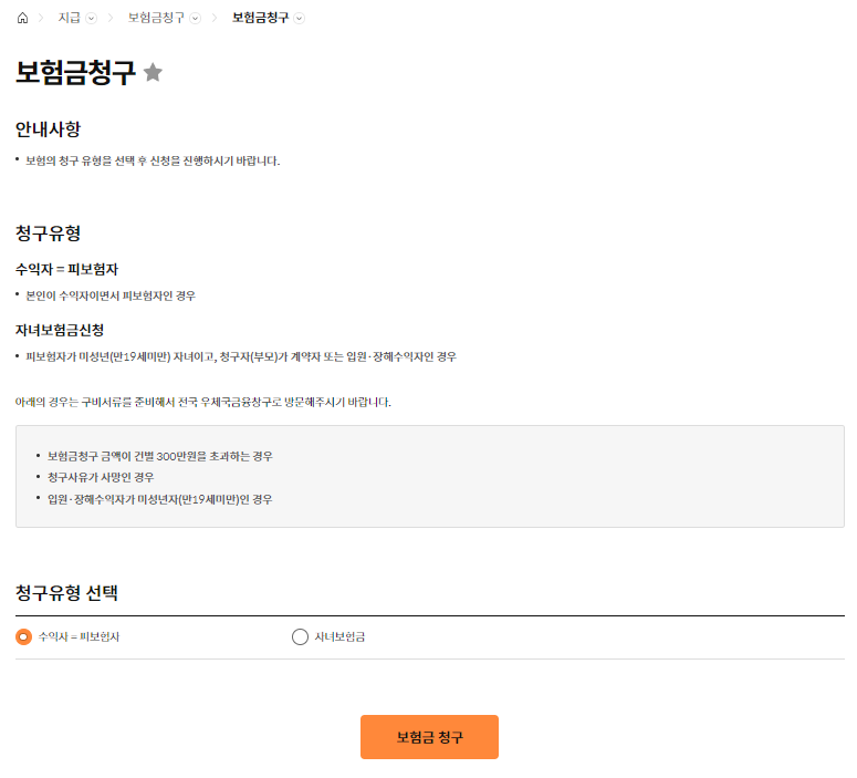 - 우체국 홈페이지에 접속하신 후 상단 메뉴에서 '지급' 을 클릭하시면 하위 메뉴에서 '보험금 청구'를 클릭해주시면 됩니다.