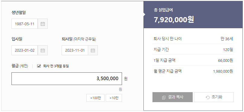 실업급여 모의 계산기에 입사일과 퇴사일을 입력해주시고, 퇴사전 3개월 임금을 입력해주시면 실업급여 지급기간 및 1일 지급액과 월 평균 지급액을 계산해 줍니다.