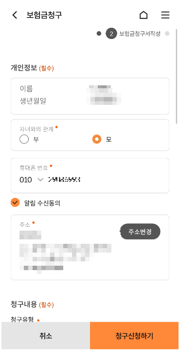 9. 보험 청구자의 인적사항을 확인 및 입력해주시면 됩니다.