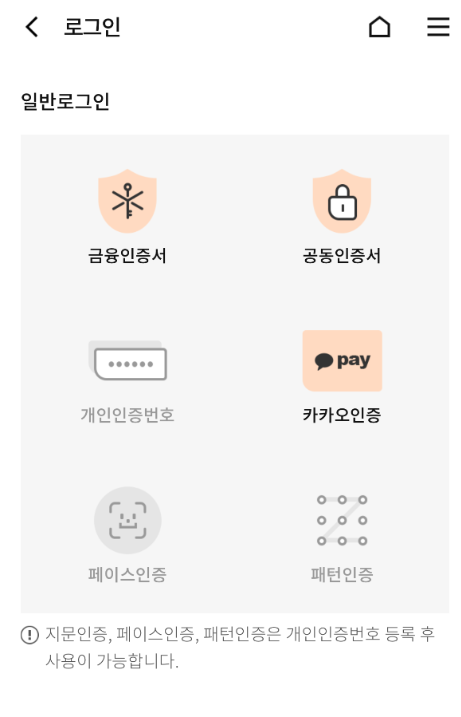 3. 로그인을 클릭하시면 금융인증서, 공동인증서, 카카오인증 등 여러가지 로그인 방법이 있습니다. 카카오인증으로 로그인하도록 하겠습니다.