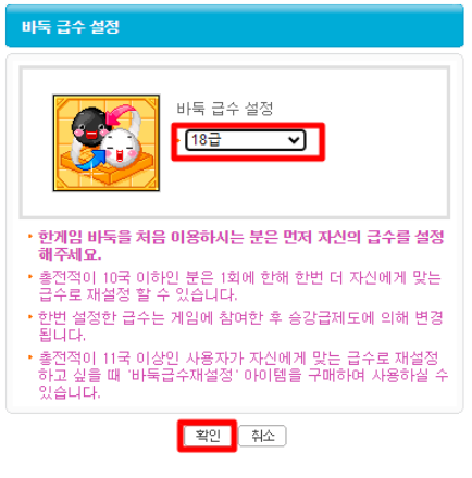 ▶ 게입을 시작하시기 전 설정화면이 나옵니다. 본인의 급수에 맞추어 선택을 하시고 '확인' 버튼을 클릭해주시면 됩니다.