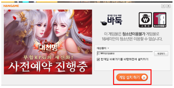 ▶ '게임 설치하기' 버튼을 클릭해주시면 바로 설치 작업이 진행되며, 조금만 기다리시면 설치가 완료되고 게임을 실행하실 수 있습니다.