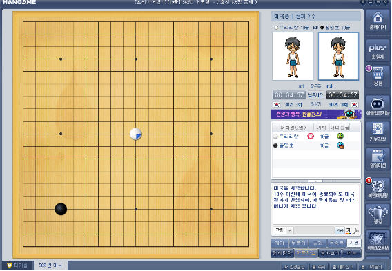 ▶ 매칭이 완료되고 상대방과 대국이 시작되면 아래와 같이 창이 나타납니다. 매칭된 상대방과 즐거운 바둑 게임한판 하시면 됩니다.