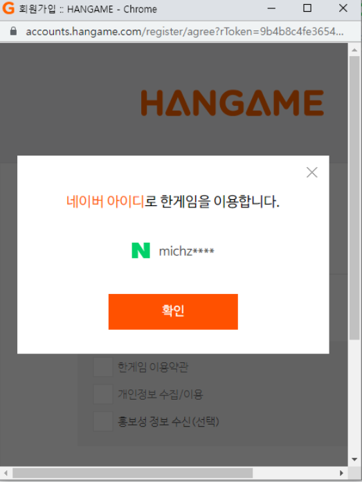 ▶ 네이버 아이디로 회원가입을 클릭하시게 되면, 아래와 같은 메세지 창이 뜨시게됩니다. '확인' 버튼을 클릭해주시면 됩니다.
