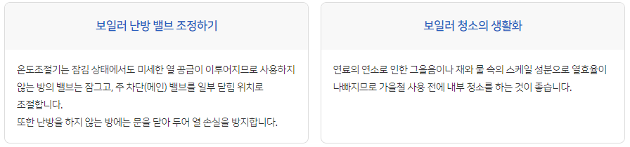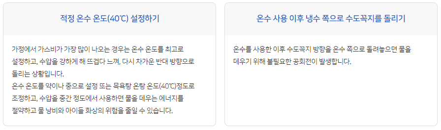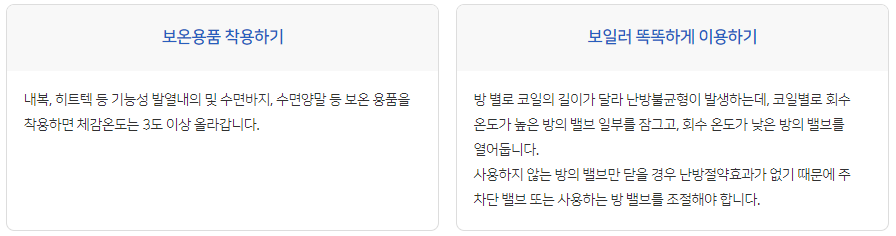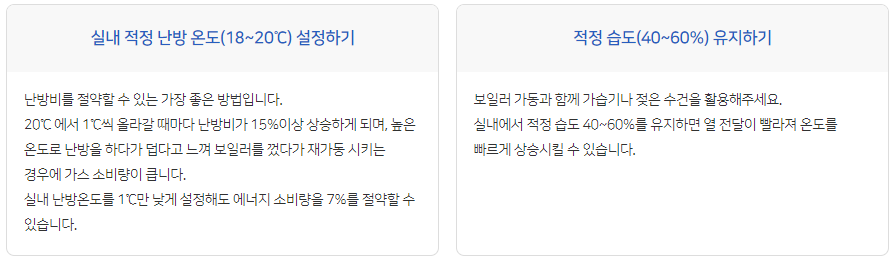 실내 적정 난방 온도(18~20℃)/적정 습도(40~60%) 유지, 적정 온수 온도(40℃) 설정, 중간 수압 사용, 외출 모드 활용