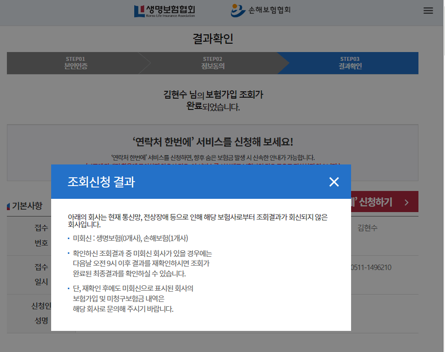 ▶ 결과확인에서 기본사항 및 보험 가입내역 조회 결과를 확인하실 수 있습니다.