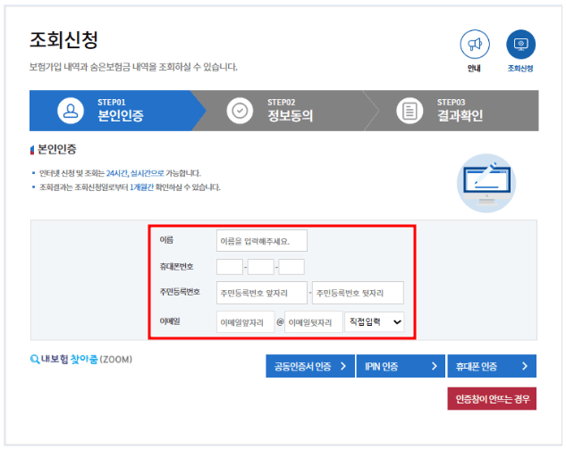 숨은 보험금 통합조회시스템은 365일, 24시간 운영하며 숨은 보험금을 찾으려면 주민등록번호, 개인정보 등을 입력하고 간편하게 본인인증절차를 거쳐야 조회가 가능합니다.
