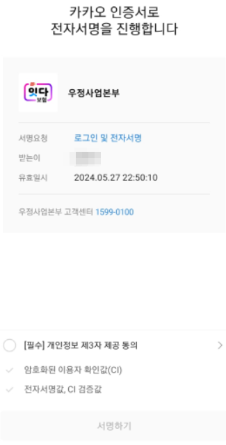 - '카카오 인증'에서 본인 인적사항을 입력하신 후 '확인' 버튼을 클릭하시면 카카오톡으로 우체국 보험 알림톡이 도착합니다. 서명 요청 안내 내용을 확인하신 후 하단에 '서명하기'를 클릭해주시면 됩니다.