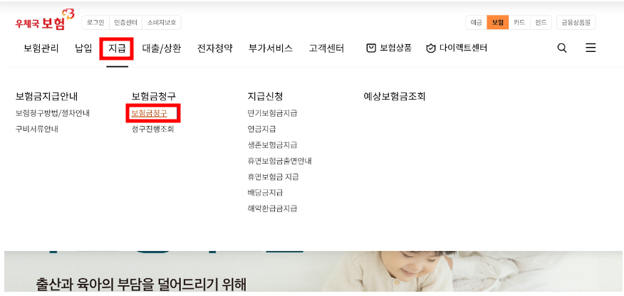 - 우체국 홈페이지에 접속하신 후 상단 메뉴에서 '지급' 을 클릭하시면 하위 메뉴에서 '보험금 청구'를 클릭해주시면 됩니다.