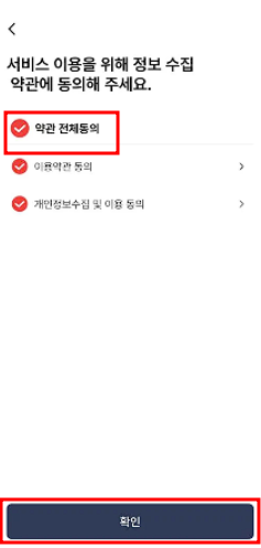 4. 다음으로 약관 내용을 확인하시고 '약관 전체동의'를 체크하신 후 '확인 버튼을 클릭해주시면 됩니다.