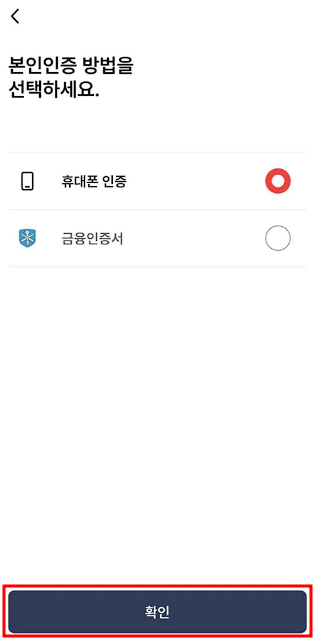 6. 본인인증 방법은 휴대폰 인증 혹은 금융인증서 인증 중에서 선택하신 후 '확인' 버튼을 클릭해주시면 됩니다.