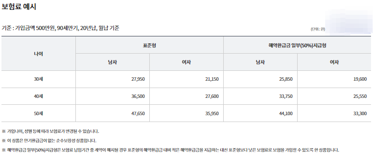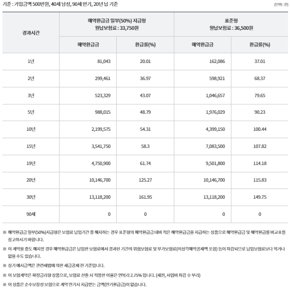 - 해약환급금 일부(50%)지급형의 경우 보험료 납입기간 중 보험계약을 해지할 경우 표준형보다 해약환급금이 적습니다.