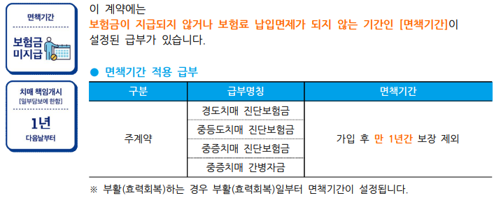 ※ 치매보장개시일은 계약일(부활(효력회복)일)부터 그 날을 포함하여 만 1년이 되는 날의 다음날부터입니다.
