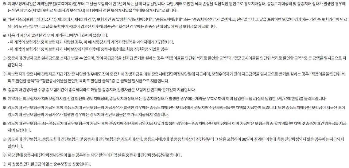 - 이 계약은 치매보장을 주목적으로 하는 보장성보험이며, 저축이나 연금수령을 목적으로 가입하시기 적합하지 않습니다.