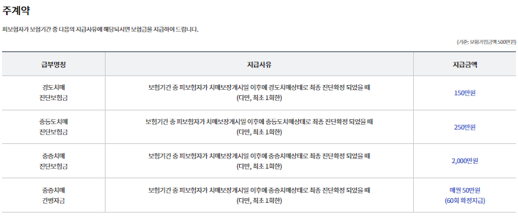중증치매만 보장하는 상품의 경우 경증 치매로는 보험금 보장을 받을 수 없기 때문에 보험 가입조건에 경도/경증 치매를 보장하는 상품인지 확인을 필수로 해야합니다.