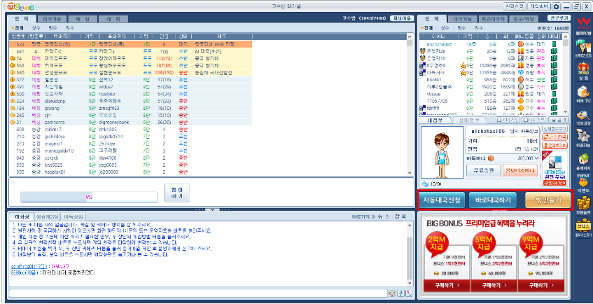 ▶ 설치가 완료되면 엠게임 바둑 대기실에 입장하게 되고, 우측 하단부분에 자동대국신청, 바로대국하기, 방만들기 메뉴가 있습니다. 원하시는 메뉴를 클릭해주시면 됩니다.