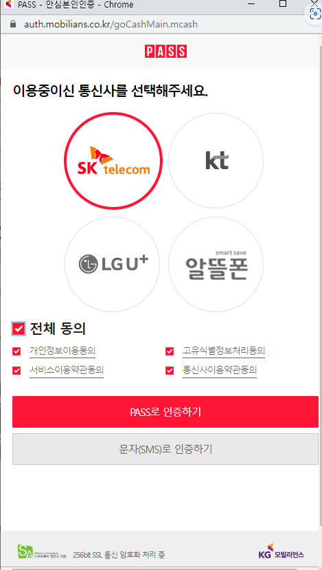▶ 본인이 이용중인 통신사를 선택하신 후 인증을 계속 진행해주시면 됩니다.