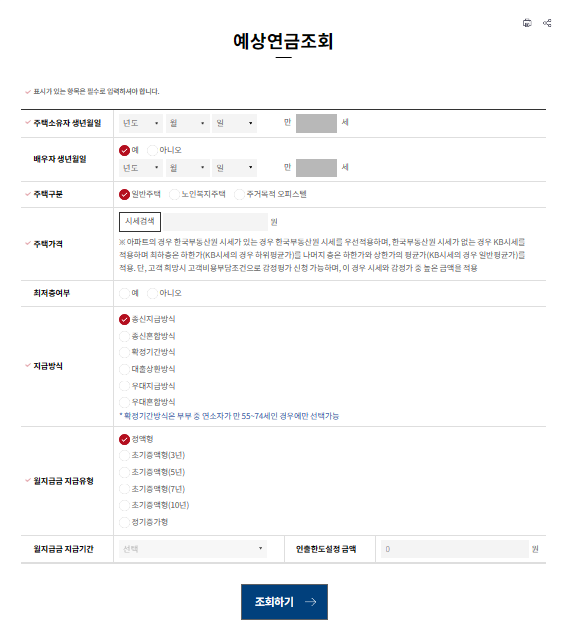 ▶ 개인인적사항을 입력하시고 아래 '조회하기'버튼을 클릭해주시면 예상 주택연금 수령액을 확인하실 수 있습니다.