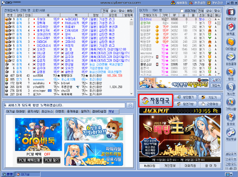 ▶ '대국실 입장하기'를 클릭하고 전체 접속자 및 대기자를 확인하실 수 있는 메인 화면을 보시게 됩니다. '자동대국'을 클릭하시면 상대방과 매칭이 시작됩니다.