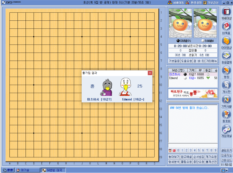 ▶ 매칭이된 상대방이 동의를 하게되면 대국실로 입장하게 됩니다. 상대방과 바둑한판을 즐기시면 됩니다.
