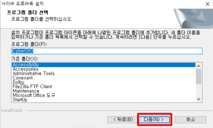 ▶ 사이버 오로바둑이 설치될 내 컴퓨터 폴더를 지정해주시면 됩니다. 원하시는 폴더를 선택하신 후 '다음'을 클릭해주시면 됩니다.