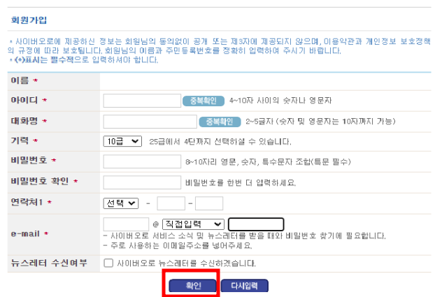 ▶ 개인정보를 입력하시고 '확인' 버튼을 클릭해시고 회원가입을 진행해주시면 됩니다.