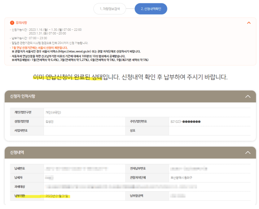 4. 자동차 연납 신청 완료 및 납부 완료를 확인하실 수 있습니다.