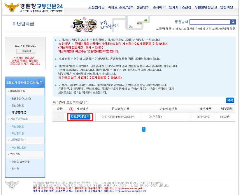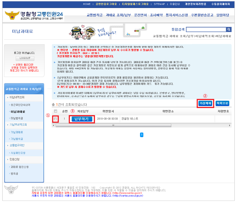 ① 가상계좌 : 범칙금의 가상계좌로 이체하여 납부할 수 있습니다.