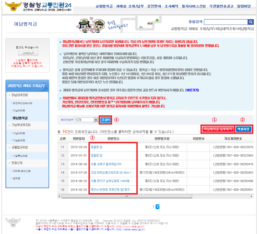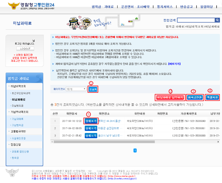 ④ 조회 : 페이지갯수로 미납범칙금 목록을 조회 할 수 있습니다.