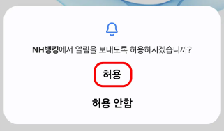 1. NH스마트 뱅킹 앱을 설치하신 후 앱을 클릭하시면 '보이스피싱 등 전자금융거래 사고 방지를 위해 귀하의 스마트폰 APP 설치 정보를 확인하며, 주의가 필요한 앱이 탐지되었을 경우 NH 스마트뱅킹 앱 이용이 제한됩니다.'라는 팝업창이 뜹니다. '동의' 버튼을 클릭해주시면 됩니다.