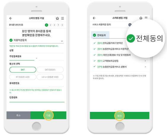 3. 휴대폰 본인인증 후 '다음' 버튼을 클릭하시면, 서비스 이용약관을 읽어보신 후 전체동의를 체크하시고 '확인' 버튼을 클릭하시면 됩니다.
