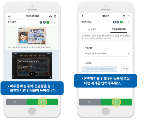 4. 본인 신분증 등록을 하신 후 '확인' 버튼을 클릭하시면, 본인확인을 위해 1원 송금할 타행계좌를 입력하신후 '확인' 버튼을 클릭해주시면 됩니다.